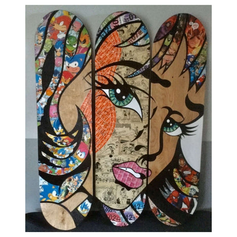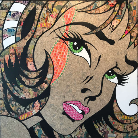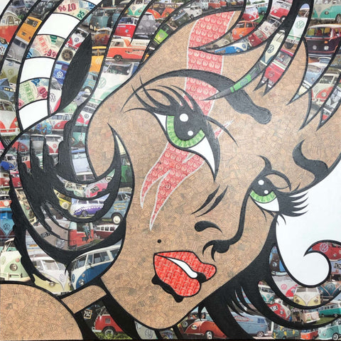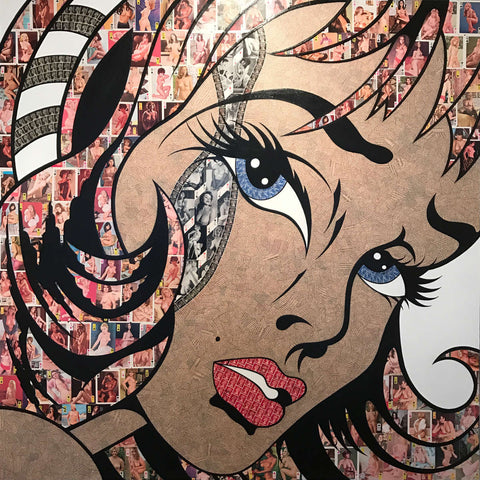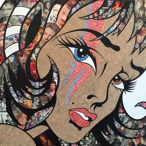 He started painting to relieve the stress from a debilitating spinal injury, which he still battles with today. His early experimental pieces involved images of Marilyn Monroe, The Krays and Jimi Hendrix. Moving forward his expression was found in the use of mixed media such as newsprint, comic books and magazine cuttings.