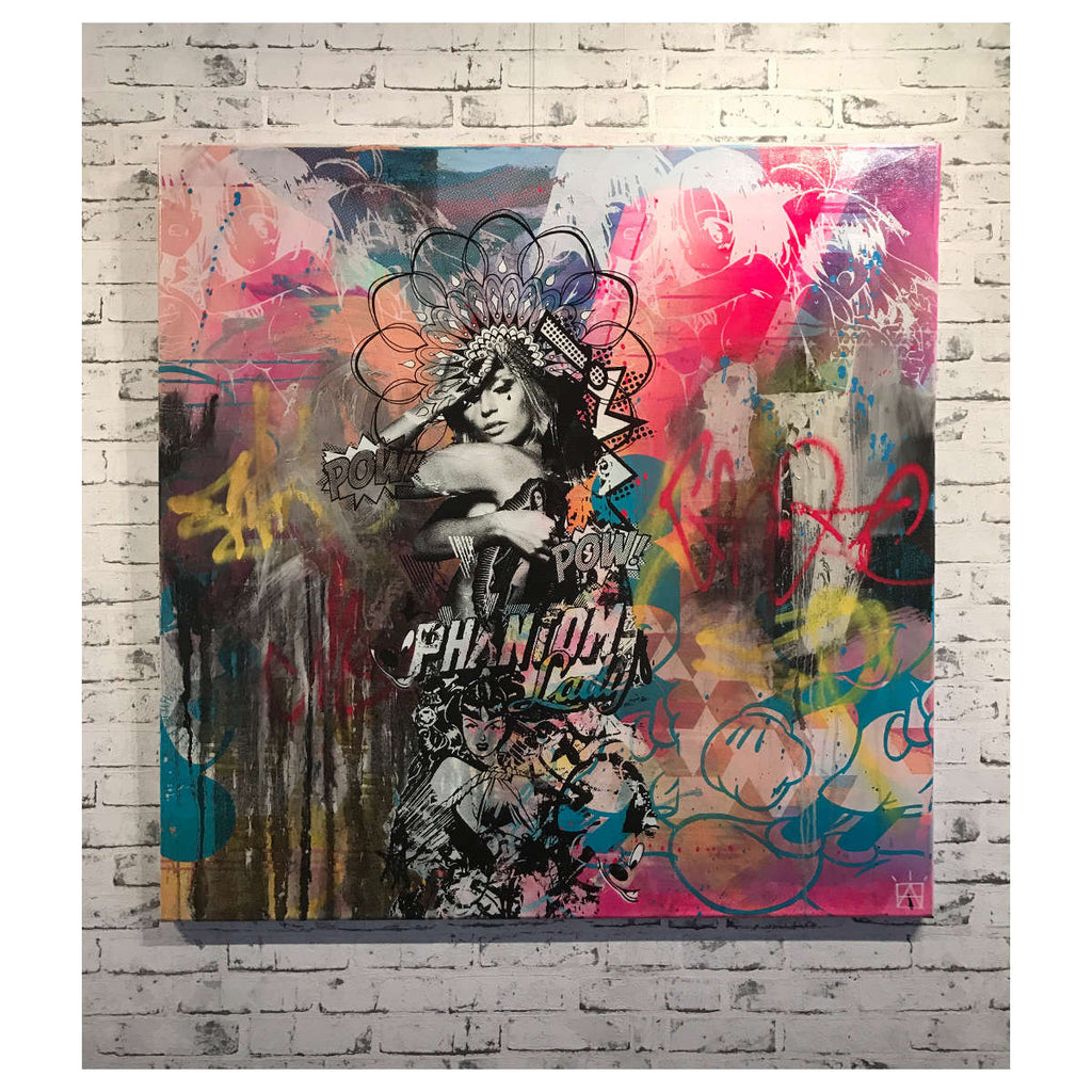 Acrylic, Collage, Billboard Paper, Spray Paint, Emulsion and Screen Print on Canvas